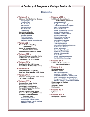 A Century of Progress %u2022 Vintage Postcards%u2022 Volume I %u2022A Second World%u2019s Fair for ChicagoDesigning the FairOpening DayThe Architecture The ExhibitsGetting AroundThe PostcardsClosing DayAbout this CollectionPhilately and the FairPostage StampsFirst Day CoversCinderella StampsCacheted Special-Event Covers%u2022 Volume II %u2022Ruben H. Donnelley Corp. Color SeriesRuben H. Donnelley Corp. Black-&-White SeriesIllinois Photogravure Co. Series%u2022 Volume III %u2022Western Photogravure Co. SeriesCurt Teich & Co. 1931 SeriesCurt Teich & Co. 1933 Series%u2022 Volume IV %u2022Curt Teich & Co. 1934 SeriesArena Photo Post Card Co. Series%u2022 Volume V %u2022Gerson Brothers Co. SeriesAmerican Colortype Co. 1933 Series%u2022 Volume VI %u2022American Colortype Co. 1934 SeriesC.R. Childs Co. Series%u2022 Volume VII %u2022Regensteiner Corp. SeriesHorder, Inc. SeriesKaufmann & Fabry SeriesSturgis Lithograph Co. Series.J.O. Stoll Co. SeriesProcess Photo Studios SeriesUnknown Publisher, RPPC SeriesExhibitor & Concessionaire Postcard SetsPicturesque BelgiumBlack Forest Village ExhibitEnglish Village%u2014Merrie EnglandFirestone Company%u2022 Volume VIII %u2022Exhibitor & Concessionaire Postcard Sets, continuedJapanese Pavilion King Solomon%u2019s TempleChinese Pavilion Jade Pagoda State of Florida ExhibitMinnesota ExhibitBraniff Airways Mail Pick-upUnited Airlines ExhibitBaltimore & Ohio Railroad Burlington RailroadRailway Express AgencyFord Motor Co. SeriesInternational Harvester Nash Motors ExhibitCuneo Press ExhibitInternational Business MachinesKraft Kitchen ExhibitWilson & CompanyHall of Religion ExhibitPanth%u00e9on de la GuerreColonial Village ExhibitDarkest AfricaRobert Ripley%u2019s OdditoriumWorld a Million Years Ago%u2022 Volume IX %u2022Exhibitor & Concessionaire Individual Postcards%u2022 Volume X %u2022Novelty PostcardsMiniature ViewsBlatz Miniature ViewsDonnelley Miniature ViewsAnonymous Miniature Views (b&w)Davis Photo Series Miniature ViewsAnonymous Miniature Views (color)Western Playing Card Miniature ViewsPhotographs of the FairAfterwordSummary ListingBibliography%u2022 Volume XI %u2022Ephemera%u2022 Volume XII %u2022Newspaper ClippingsContents