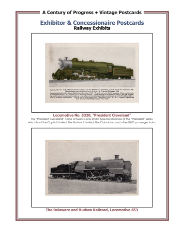 A Century of Progress %u2022 Vintage PostcardsThe Delaware and Hudson Railroad, Locomotive 653Exhibitor & Concessionaire PostcardsRailway ExhibitsLocomotive No. 5320, %u201cPresident Cleveland%u201dThe %u201cPresident Cleveland%u201d is one of twenty-one similar type locomotives of the %u201cPresident%u201d series, which haul the Capitol Limited, the National Limited, the Columbian and other B&O passenger trains.