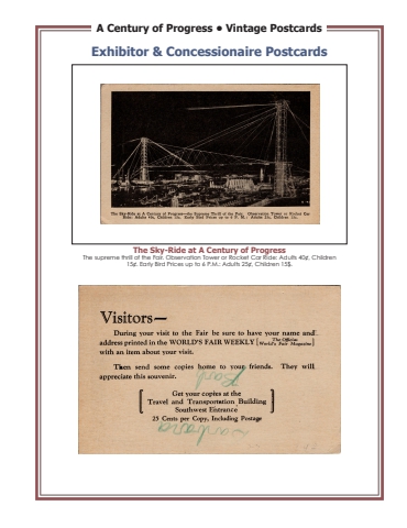 A Century of Progress %u2022 Vintage PostcardsExhibitor & Concessionaire PostcardsThe Sky-Ride at A Century of ProgressThe supreme thrill of the Fair. Observation Tower or Rocket Car Ride: Adults 40%u00a2, Children 15%u00a2. Early Bird Prices up to 6 P.M.: Adults 25%u00a2, Children 15$.