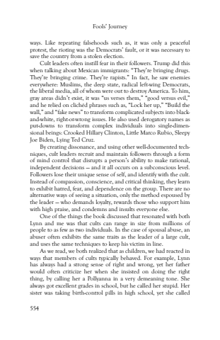 Fools%u2019 Journey554ways. Like repeating falsehoods such as, it was only a peaceful protest, the rioting was the Democrats%u2019 fault, or it was necessary to save the country from a stolen election.Cult leaders often instill fear in their followers. Trump did this when talking about Mexican immigrants: %u201cThey%u2019re bringing drugs. They%u2019re bringing crime. They%u2019re rapists.%u201d In fact, he saw enemies everywhere: Muslims, the deep state, radical left-wing Democrats, the liberal media, all of whom were out to destroy America. To him, gray areas didn%u2019t exist, it was %u201cus verses them,%u201d %u201cgood versus evil,%u201d and he relied on clich%u00e9d phrases such as, %u201cLock her up,%u201d %u201cBuild the wall,%u201d and %u201cfake news%u201d to transform complicated subjects into blackand-white, right-or-wrong issues. He also used derogatory names as put-downs to transform complex individuals into single-dimensional beings: Crooked Hillary Clinton, Little Marco Rubio, Sleepy Joe Biden, Lying Ted Cruz. By creating dissonance, and using other well-documented techniques, cult leaders recruit and maintain followers through a form of mind control that disrupts a person%u2019s ability to make rational, independent decisions %u2014 and it all occurs on a subconscious level. Followers lose their unique sense of self, and identify with the cult. Instead of compassion, conscience, and critical thinking, they learn to exhibit hatred, fear, and dependence on the group. There are no alternative ways of seeing a situation, only the method espoused by the leader %u2014 who demands loyalty, rewards those who support him with high praise, and condemns and insults everyone else.One of the things the book discussed that resonated with both Lynn and me was that cults can range in size from millions of people to as few as two individuals. In the case of spousal abuse, an abuser often exhibits the same traits as the leader of a large cult, and uses the same techniques to keep his victim in line. As we read, we both realized that as children, we had reacted in ways that members of cults typically behaved. For example, Lynn has always had a strong sense of right and wrong, yet her father would often criticize her when she insisted on doing the right thing, by calling her a Pollyanna in a very demeaning tone. She always got excellent grades in school, but he called her stupid. Her sister was taking birth-control pills in high school, yet she called
