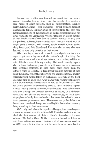 Fools%u2019 Journey560Because our reading was focused on non-fiction, we leaned toward biography, history, travel, etc. But also books covering a wide range of other subjects, such as transportation, science, health, religion, crime %u2014 even linguistics %u2014 as well as many difficultto-categorize topics. Popular areas of interest from the past have included all aspects of the space age, as well as biographies and histories related to the Manhattan Project. Although we didn%u2019t care for all their books, some of our favorite authors, for both writing style and preferred subjects, have included Paul Theroux, David McCullough, Jeffery Toobin, Bill Bryson, Sarah Vowell, Oliver Sachs, Mary Roach, and Bob Woodward. Plus countless writers who were destined to have only one title to their name.When starting a new book, it would typically take me just a few pages to get into a rhythm with the author%u2019s style of writing. But when an author used a lot of quotations, each having a different voice, I%u2019d often stumble in my reading. This would usually happen when a book had many quotes from a different era or a non-standard sentence structure. In such cases, when going from the author%u2019s voice to a quote, I%u2019d find myself looking carefully at each word the quote, rather that absorbing the whole sentence, and my comprehension would falter. In such cases, I%u2019d often set the book aside and pick up a new one. After all, we were reading for pleasure, and I didn%u2019t want to have to work so hard to follow the story. This was only a problem when reading aloud to Lynn. It didn%u2019t happen if I was reading silently to myself, likely because I was able to mentally slur through an unusual sentence structure, or a different voice, and still absorb the meaning. Interestingly, we read some biographies of early Russian leaders that were loaded with quotations, yet were quite easy to read. The reason was probably because the authors translated the quotes into English themselves, so everything ended up in their own voices.We%u2019d only read a handful of political biographies over the years because we often found the writing dull. That changed after we finished the first volume of Robert Caro%u2019s biography of Lyndon Johnson, The Path to Power. Neither Lynn nor I cared for Johnson, but Caro%u2019s writing was so good that we read all four volumes %u2014 close to 3,000 pages. By the time we got through them, we were hoping