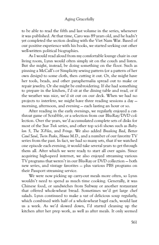 Aging Gracefully561to be able to read the fifth and last volume in the series, whenever it was published. At that time, Caro was 89 years old, and he hadn%u2019t yet completed the section dealing with the Viet Nam War. Based of our positive experience with his books, we started seeking out other well-written political biographies.As I would read aloud from my comfortable lounge chair in our living room, Lynn would often simply sit on the couch and listen. But she might, instead, be doing something on the floor. Such as pinning a McCall%u2019s or Simplicity sewing pattern (or a pattern of her own design) to some cloth, then cutting it out. Or, she might have her tools, beads, and other paraphernalia spread out to make or repair jewelry. Or she might be embroidering. If she had something to prepare in the kitchen, I%u2019d sit at the dining table and read, or if the weather was nice, we%u2019d sit out on our deck. When we had no projects to interfere, we might have three reading sessions a day %u2014 morning, afternoon, and evening %u2014 each lasting an hour or so.After reading in the early evenings, we regularly enjoyed a cutthroat game of Scrabble, or a selection from our Blu-Ray/DVD collection. Over the years, we%u2019d accumulated complete sets of disks for most of the Star Trek series, and other top sci-fi shows such as Babylon 5, The X-Files, and Fringe. We also added Breaking Bad, Better Caul Saul, Twin Peaks, House M.D., and a number of our favorite TV series from the past. In fact, we had so many sets, that if we watched one episode each evening, it would take several years to get through them all. After which we were ready to start all over again. Since acquiring high-speed internet, we also enjoyed streaming various TV programs that weren%u2019t in our Blu-Ray or DVD collection %u2014 both new series, and vintage favorites %u2014 plus various PBS programs on their Passport streaming service.We were now picking up carry-out meals more often, so Lynn wouldn%u2019t need to spend as much time cooking. Generally, it was Chinese food, or sandwiches from Subway or another restaurant that offered whole-wheat bread. Sometimes we%u2019d get large chef salads. Lynn continued to make a vat of delicious soup regularly, which combined with half of a whole-wheat bagel each, would last us a week. As we%u2019d slowed down, I%u2019d started cleaning up the kitchen after her prep work, as well as after meals. It only seemed