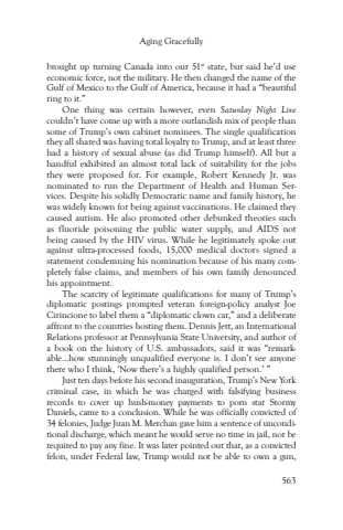 Aging Gracefully563brought up turning Canada into our 51st state, but said he%u2019d use economic force, not the military. He then changed the name of the Gulf of Mexico to the Gulf of America, because it had a %u201cbeautiful ring to it.%u201d One thing was certain however, even Saturday Night Livecouldn%u2019t have come up with a more outlandish mix of people than some of Trump%u2019s own cabinet nominees. The single qualification they all shared was having total loyalty to Trump, and at least three had a history of sexual abuse (as did Trump himself). All but a handful exhibited an almost total lack of suitability for the jobs they were proposed for. For example, Robert Kennedy Jr. was nominated to run the Department of Health and Human Services. Despite his solidly Democratic name and family history, he was widely known for being against vaccinations. He claimed they caused autism. He also promoted other debunked theories such as fluoride poisoning the public water supply, and AIDS not being caused by the HIV virus. While he legitimately spoke out against ultra-processed foods, 15,000 medical doctors signed a statement condemning his nomination because of his many completely false claims, and members of his own family denounced his appointment.The scarcity of legitimate qualifications for many of Trump%u2019s diplomatic postings prompted veteran foreign-policy analyst Joe Cirincione to label them a %u201cdiplomatic clown car,%u201d and a deliberate affront to the countries hosting them. Dennis Jett, an International Relations professor at Pennsylvania State University, and author of a book on the history of U.S. ambassadors, said it was %u201cremarkable%u2026how stunningly unqualified everyone is. I don%u2019t see anyone there who I think, %u2018Now there%u2019s a highly qualified person.%u2019 %u201d Just ten days before his second inauguration, Trump%u2019s New York criminal case, in which he was charged with falsifying business records to cover up hush-money payments to porn star Stormy Daniels, came to a conclusion. While he was officially convicted of 34 felonies, Judge Juan M. Merchan gave him a sentence of unconditional discharge, which meant he would serve no time in jail, nor be required to pay any fine. It was later pointed out that, as a convicted felon, under Federal law, Trump would not be able to own a gun,