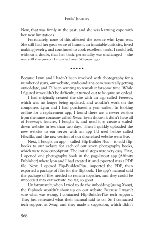 Fools%u2019 Journey566Now, that was firmly in the past, and she was learning cope with her new limitations. Fortunately, none of this affected the essence who Lynn was. She still had her great sense of humor, an insatiable curiosity, loved making jewelry, and continued to cook excellent meals. I could tell, without a doubt, that her basic personality was unchanged %u2014 she was still the person I married over 50 years ago.%u2022%u2022%u2022%u2022%u2022Because Lynn and I hadn%u2019t been involved with photography for a number of years, our website, studioindiana.com, was really getting out-of-date, and I%u2019d been wanting to rework it for some time. While I figured it wouldn%u2019t be difficult, it turned out to be quite an ordeal.I had originally created the site with an app called Freeway, which was no longer being updated, and wouldn%u2019t work on the computers Lynn and I had purchased a year earlier. In looking online for a replacement app, I found there was a newer version from the same company called Xway. Even though it didn%u2019t have all of Freeway%u2019s features, I bought it, and used it to create a scaleddown website in less than two days. Then I quickly uploaded the new website to our server with an app I%u2019d used before called Filezilla, and the new version of our downsized website went live.Next, I bought an app %u2014 called Flip-Builder-Plus %u2014 to add flipbooks to our website for each of our seven photography books, which were now out-of-print. The initial steps were very easy. First, I opened one photography book in the page-layout app (Affinity Publisher) where lynn and I had created it, and exported it as a PDF file. Next, I opened Flip-Builder-Plus, imported the PDF, then exported a package of files for the flipbook. The app%u2019s manual said the package of files needed to remain together, and they could be imbedded into our website. So far, so good.Unfortunately, when I tried to do the imbedding (using Xway), the flipbook wouldn%u2019t show up on our website. Because I wasn%u2019t sure what was wrong, I contacted Flip-Builder-Plus tech support. They just reiterated what their manual said to do. So I contacted tech support at Xway, and they made a suggestion, which didn%u2019t