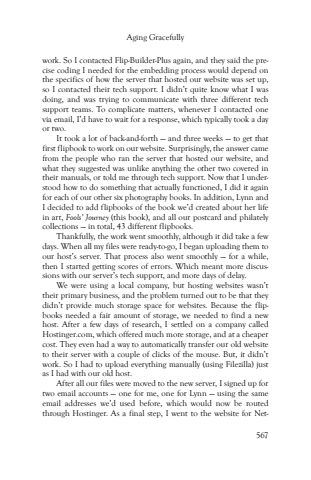 Aging Gracefully567work. So I contacted Flip-Builder-Plus again, and they said the precise coding I needed for the embedding process would depend on the specifics of how the server that hosted our website was set up, so I contacted their tech support. I didn%u2019t quite know what I was doing, and was trying to communicate with three different tech support teams. To complicate matters, whenever I contacted one via email, I%u2019d have to wait for a response, which typically took a day or two.It took a lot of back-and-forth %u2014 and three weeks %u2014 to get that first flipbook to work on our website. Surprisingly, the answer came from the people who ran the server that hosted our website, and what they suggested was unlike anything the other two covered in their manuals, or told me through tech support. Now that I understood how to do something that actually functioned, I did it again for each of our other six photography books. In addition, Lynn and I decided to add flipbooks of the book we%u2019d created about her life in art, Fools%u2019 Journey (this book), and all our postcard and philately collections %u2014 in total, 43 different flipbooks. Thankfully, the work went smoothly, although it did take a few days. When all my files were ready-to-go, I began uploading them to our host%u2019s server. That process also went smoothly %u2014 for a while, then I started getting scores of errors. Which meant more discussions with our server%u2019s tech support, and more days of delay. We were using a local company, but hosting websites wasn%u2019t their primary business, and the problem turned out to be that they didn%u2019t provide much storage space for websites. Because the flipbooks needed a fair amount of storage, we needed to find a new host. After a few days of research, I settled on a company called Hostinger.com, which offered much more storage, and at a cheaper cost. They even had a way to automatically transfer our old website to their server with a couple of clicks of the mouse. But, it didn%u2019t work. So I had to upload everything manually (using Filezilla) just as I had with our old host.After all our files were moved to the new server, I signed up for two email accounts %u2014 one for me, one for Lynn %u2014 using the same email addresses we%u2019d used before, which would now be routed through Hostinger. As a final step, I went to the website for Net-