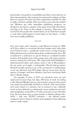 Aging Gracefully569had another non-profit as a possibility, and when I met with two of their representatives, they seemed very interested in taking on Ghost Barns as a project, but were sure their organization wouldn%u2019t be able to make a decision quickly. After more than a year, they also backed out. Without any other immediate publishing prospects, we decided to put about a quarter of the pages from both Ghost Barnsand Signs of the Times on the website as previews. They were well received by the people who viewed them, yet we held back enough so each title would appeal to book buyers in the future %u2014 if they were ever actually published. %u2022%u2022%u2022%u2022%u2022Ever since Lynn and I moved to rural Monroe County in 1984, we%u2019d been subject to occasional electrical outages more often than if we%u2019d lived in town %u2014 usually the result of trees or large branches falling during storms and knocking down overhead power lines. We considered it a small price to pay for living in a secluded wooded location. Fortunately, most of the outages were only minor inconveniences, lasting but a few hours. We coped easily with flashlights, a battery-powered radio, and eating a meal or two in Bloomington. At one point, we bought a rechargeable 110-volt back-up battery that had enough capacity to use in the evenings for a reading lamp, or for our television and DVD player. But in recent years, the frequency of outages, and their duration, had been increasing, likely due to climate change.For example, in June of 2023 our electricity went out and stayed out for more than four days, 104 hours in total. According to the National Weather Service, the long line of storms that caused our outage was technically classified as a derecho. Like most people, we%u2019d never heard of a derecho, but we learned it was a Spanish word, and was defined as a widespread, severe windstorm over land with straight-line winds (58 to 75 miles an hour) at least 250-miles long. Because there were so many people in Indiana without electricity %u2014 well over 100,000 customers %u2014 the affected power companies had to bring in workers and equipment from adjoining states to make repairs.