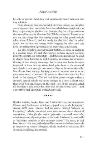 Aging Gracefully571be able to tolerate. And they cost significantly more than our battery solution. Now, when we have an extended electrical outage, we can plug our refrigerator into one of the batteries, which has enough juice to keep it operating for the first day, then we plug the refrigerator into the second battery for the next day. While the second battery is in use, we can charge the first battery using the solar panels (which takes about 7 hours), and it%u2019s ready for the third day. In other words, we can use one battery while charging the other, and can keep our refrigerator operating for as many days as necessary. We also bought a second smaller battery, so now, in addition to a reading lamp, TV and DVD player, we have enough portable power to operate our computers %u2014 and the solar panels can be used to charge those batteries as well. Granted, we%u2019d have no air conditioning or heat during an outage, but because our house is superinsulated, it loses heat in winter (and gains heat in the summer) very slowly %u2014 not enough over several days to be uncomfortable. Nor do we have enough back-up power to operate our stove or microwave oven, so we eat cold meals or drive into town for hot food. In the spring of 2024, we had three power outages within a six-week period, which was more outages in a such a short time than we%u2019d ever experienced in the past. Two of the outages lasted for less than a day, while the other was for almost two days %u2014 and our battery back-up system worked quite well.%u2022%u2022%u2022%u2022%u2022Besides reading books, Lynn and I subscribed to two magazines, Discover and Smithsonian, which we enjoyed very much. In its July/August 2025 issue, Discover had an article entitled %u201cAllergic to Everything,%u201d which contained some information about chemical sensitivities, although the article primarily discussed mast cells, which exist virtually everywhere in the body. It referred to mast cells as %u201cfrontline sentinels of the immune system.%u201d For years, it had been known that mast cells released histamine and other chemicals in response to natural allergens, which resulted in reactions like sneezing, coughing, and itching.