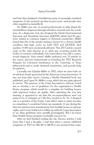Aging Gracefully573and how they displayed a bewildering array of seemingly unrelated symptoms. It also pointed out that in prior years, such people were often regarded as mentally ill.Dr. Miller was one of several professionals to help dispel the mental-illness diagnosis through relentless research into the condition. As a diagnostic tool, she designed the Quick Environmental Exposure and Sensitivity Inventory (QEESI), which had 50 questions related to common triggers of chemical sensitivities. Miller found that 6% of the people visiting a doctor for a chronic health condition had high scores on both TILT and QUEESI. And another 15.8% were moderately affected. This 2013 article covered some of the early theories as to what was occurring inside the bodies of sensitive individuals, but noted that it was still a controversial diagnosis. Now retired, Miller authored over 70 articles in her career, and was instrumental in founding the TILT Research Program for Chemical Intolerance at the University of Texas (tiltresearch.org) to study chemical sensitivities, and provide help for patients.I actually met Claudia Miller in 2002, when we were both on an advisory board sponsored by the American Lung Association. It was not long after Lynn%u2019s Creating a Healthy Household book was published, and I gave Dr. Miller a copy, which she was quite pleased to receive. The purpose of the Lung Association%u2019s advisory board was to develop a set of guidelines for the organization%u2019s Health House program, which would be a template for building houses with improved indoor air quality. After attending the very first meeting, it appeared to me that the recommendations were not going to be as stringent as I felt they needed to be. So, I dropped out as a member of the board. I just didn%u2019t want to waste my time on something I considered below my standards. It was during the time my interests were transitioning from healthy houses to photography, and I never bothered to follow up with the Lung Association to see what guidelines were actually promulgated. But I do know their Health House program eventually ceased to be. After we had finished reading the two Discover articles, I told Lynn that I had a thought. I said that when a person exhibited symptoms of TILT (or MCAS or MCS) it was assumed that some-