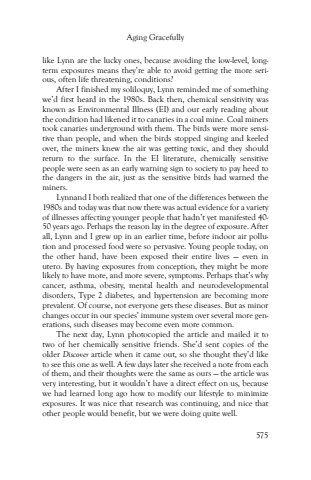 Aging Gracefully575like Lynn are the lucky ones, because avoiding the low-level, longterm exposures means they%u2019re able to avoid getting the more serious, often life threatening, conditions? After I finished my soliloquy, Lynn reminded me of something we%u2019d first heard in the 1980s. Back then, chemical sensitivity was known as Environmental Illness (EI) and our early reading about the condition had likened it to canaries in a coal mine. Coal miners took canaries underground with them. The birds were more sensitive than people, and when the birds stopped singing and keeled over, the miners knew the air was getting toxic, and they should return to the surface. In the EI literature, chemically sensitive people were seen as an early warning sign to society to pay heed to the dangers in the air, just as the sensitive birds had warned the miners.Lynnand I both realized that one of the differences between the 1980s and today was that now there was actual evidence for a variety of illnesses affecting younger people that hadn%u2019t yet manifested 40-50 years ago. Perhaps the reason lay in the degree of exposure. After all, Lynn and I grew up in an earlier time, before indoor air pollution and processed food were so pervasive. Young people today, on the other hand, have been exposed their entire lives %u2014 even in utero. By having exposures from conception, they might be more likely to have more, and more severe, symptoms. Perhaps that%u2019s why cancer, asthma, obesity, mental health and neurodevelopmental disorders, Type 2 diabetes, and hypertension are becoming more prevalent. Of course, not everyone gets these diseases. But as minor changes occur in our species%u2019 immune system over several more generations, such diseases may become even more common.The next day, Lynn photocopied the article and mailed it to two of her chemically sensitive friends. She%u2019d sent copies of the older Discover article when it came out, so she thought they%u2019d like to see this one as well. A few days later she received a note from each of them, and their thoughts were the same as ours %u2014 the article was very interesting, but it wouldn%u2019t have a direct effect on us, because we had learned long ago how to modify our lifestyle to minimize exposures. It was nice that research was continuing, and nice that other people would benefit, but we were doing quite well.
