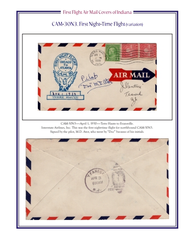 CAM-30N3%u2014%u2014April 1, 1930%u2014%u2014Terre Haute to Evansville.Interstate Airlines, Inc. This was the first night-time flight for northbound CAM-30N3. Signed by the pilot, M.D. Ator, who went by %u201cDoc%u201d because of his initials.