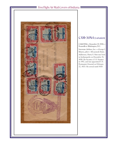 CAM-30N4%u2014%u2014November 19, 1928%u2014%u2014Evansville to Washington, D.C.Interstate Airlines, Inc.%u2014%u2014George I. Meyers, pilot%u2014%u2014161 pounds flown.Addressee, Harry S. New was born in Indianapolis on December 31, 1858. He became a U.S. Senator in 1917, and was appointed U.S. Postmaster General on February 27, 1923. He served until 1929.