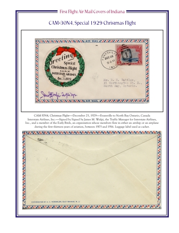 CAM-30N4, Christmas Flight%u2014%u2014December 25, 1929%u2014%u2014Evansville to North Bay Ontario, CanadaInterstate Airlines, Inc.%u2014%u2014Signed by Signed by James M. Wulpi, the Traffic Manager for Interstate Airlines, Inc., and a member of the Early Birds, an organization whose members flew in either an airship or an airplane during the first thirteen years of aviation, between 1903 and 1916. Luggage label used as cachet.