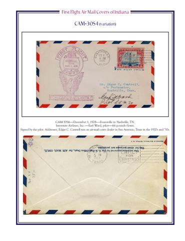 CAM-30S4%u2014%u2014December 1, 1928%u2014%u2014Evansville to Nashville, TN.Interstate Airlines, Inc.%u2014%u2014Earl Ward, pilot%u2014%u201466 pounds flown.Signed by the pilot. Addressee, Edgar C. Cantrell was an air-mail cover dealer in San Antonio, Texas in the 1920s and %u201830s.