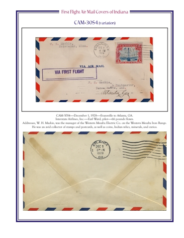 CAM-30S4%u2014%u2014December 1, 1928%u2014%u2014Evansville to Atlanta, GA.Interstate Airlines, Inc.%u2014%u2014Earl Ward, pilot%u2014%u201466 pounds flown.Addressee, W. H. Mackie, was the manager of the Western Mesaba Electric Co. on the Western Mesaba Iron Range. He was an avid collector of stamps and postcards, as well as coins, Indian relics, minerals, and curios.