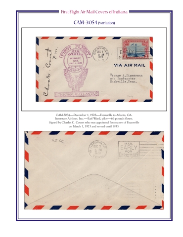 CAM-30S4%u2014%u2014December 1, 1928%u2014%u2014Evansville to Atlanta, GA.Interstate Airlines, Inc.%u2014%u2014Earl Ward, pilot%u2014%u201466 pounds flown.Signed by Charles C. Covert who was appointed Postmaster of Evansville on March 1, 1923 and served until 1933.