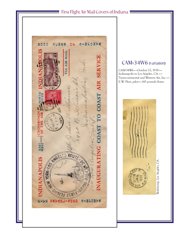 CAM-34W6%u2014%u2014October 25, 1930%u2014%u2014Indianapolis to Los Angeles, CA.%u2014%u2014Transcontinental and Western Air, Inc.%u2014%u2014E.W. Fleet, pilot%u2014%u2014143 pounds flown. Backstamp, Los Angeles, CA.