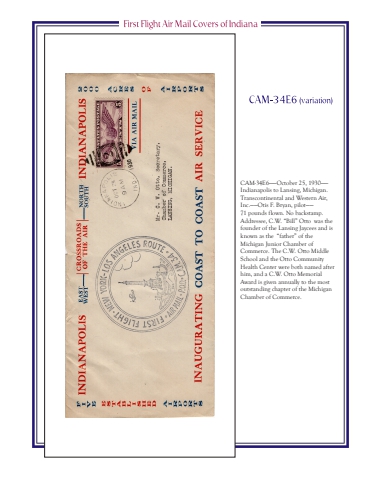 CAM-34E6%u2014%u2014October 25, 1930%u2014%u2014Indianapolis to Lansing, Michigan.Transcontinental and Western Air, Inc.%u2014%u2014Otis F. Bryan, pilot%u2014%u201471 pounds flown. No backstamp. Addressee, C.W. %u201cBill%u201d Otto was the founder of the Lansing Jaycees and is known as the %u201cfather%u201d of the Michigan Junior Chamber of Commerce. The C.W. Otto Middle School and the Otto Community Health Center were both named after him, and a C.W. Otto Memorial Award is given annually to the most outstanding chapter of the Michigan Chamber of Commerce.