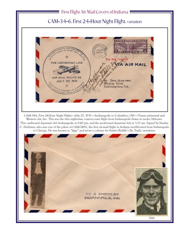 CAM-34-6, First 24-Hour Night Flight%u2014%u2014July 20, 1931%u2014%u2014Indianapolis to Columbus, OH%u2014%u2014Transcontinental and Western Air, Inc. This was the first night-time coast-to-coast flight from Indianapolis flown in under 24-hours.This eastbound departure left Indianapolis at 9:40 pm, and the westbound departure left at 3:23 am. Signed by Stanley C. Huffman, who was one of the pilots of CAM-24N2, the first air-mail flight in Indiana northbound from Indianapolis to Chicago. He was known as %u201cJiggs%u201d and wrote a column for Embry Riddle%u2019s Sky Traffic newsletter.Jiggs