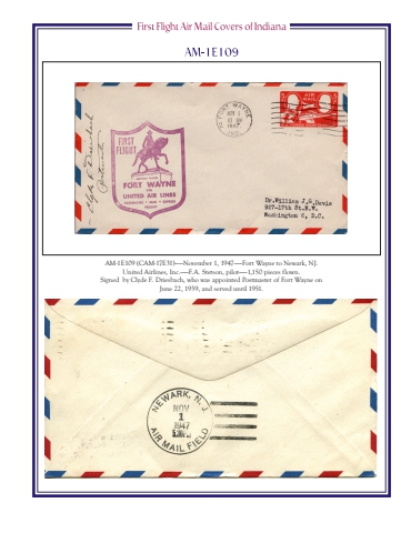 AM-1E109 (CAM-17E31)%u2014%u2014November 1, 1947%u2014%u2014Fort Wayne to Newark, NJ.United Airlines, Inc.%u2014%u2014F.A. Stetson, pilot%u2014%u20141,150 pieces flown.Signed by Clyde F. Driesbach, who was appointed Postmaster of Fort Wayne on June 22, 1939, and served until 1951.