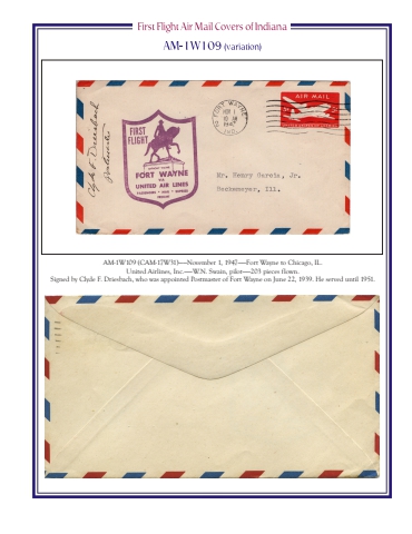 AM-1W109 (CAM-17W31)%u2014%u2014November 1, 1947%u2014%u2014Fort Wayne to Chicago, IL.United Airlines, Inc.%u2014%u2014W.N. Swain, pilot%u2014%u2014203 pieces flown.Signed by Clyde F. Driesbach, who was appointed Postmaster of Fort Wayne on June 22, 1939. He served until 1951.
