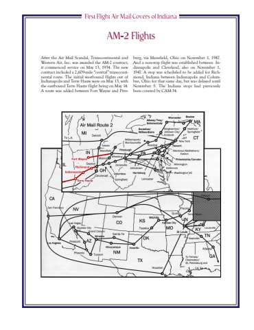 After the Air Mail Scandal, Transcontinental and Western Air, Inc. was awarded the AM-2 contract, it commenced service on May 13, 1934. The new contract included a 2,609-mile %u201ccentral%u201d transcontinental route. The initial westbound flights out of Indianapolis and Terre Haute were on May 13, with the eastbound Terre Haute flight being on May 14. A route was added between Fort Wayne and Pittsburg, via Mansfield, Ohio on November 1, 1947. And a non-stop flight was established between Indianapolis and Cleveland, also on November 1, 1947. A stop was scheduled to be added for Richmond, Indiana between Indianapolis and Columbus, Ohio for that same day, but was delayed until November 5. The Indiana stops had previously been covered by CAM-34.