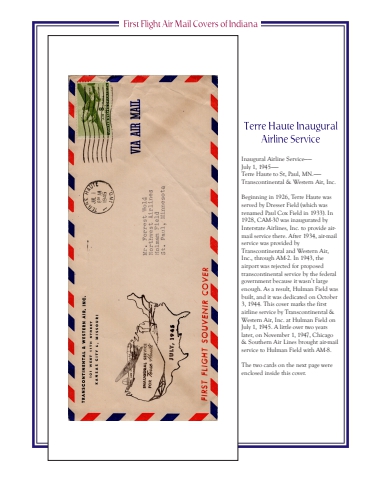Inaugural Airline Service%u2014%u2014July 1, 1945%u2014%u2014Terre Haute to St, Paul, MN.%u2014%u2014 Transcontinental & Western Air, Inc.Beginning in 1926, Terre Haute was served by Dresser Field (which was renamed Paul Cox Field in 1933). In 1928, CAM-30 was inaugurated by Interstate Airlines, Inc. to provide airmail service there. After 1934, air-mail service was provided by Transcontinental and Western Air, Inc., through AM-2. In 1943, the airport was rejected for proposed transcontinental service by the federal government because it wasn%u2019t large enough. As a result, Hulman Field was built, and it was dedicated on October 3, 1944. This cover marks the first airline service by Transcontinental & Western Air, Inc. at Hulman Field on July 1, 1945. A little over two years later, on November 1, 1947, Chicago & Southern Air Lines brought air-mail service to Hulman Field with AM-8.The two cards on the next page were enclosed inside this cover.