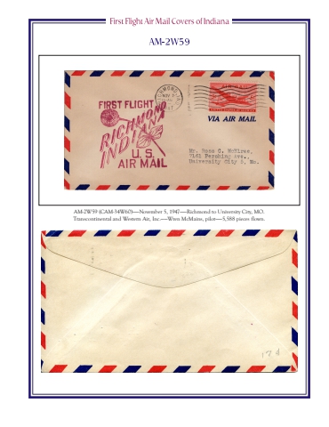AM-2W59 (CAM-34W60)%u2014%u2014November 5, 1947%u2014%u2014Richmond to University City, MO.Transcontinental and Western Air, Inc.%u2014%u2014Wren McMains, pilot%u2014%u20145,588 pieces flown.