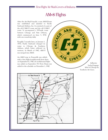 After the Air Mail Scandal, a new AM-8 Route was established and awarded to Pacific Seaboard Airlines, Inc. It consisted of a part of the old CAM-33 route and the old CAM-2 route. It encompassed a 903-mile route between Chicago and New Orleans, which commenced on June 3, 1934 with one round-trip daily.Roughly 7 months later, on January 1, 1935, Pacific Seaboard changed its name to Chicago & Southern Airlines, which better reflected its territory. In March of 1947, AM-53 was merged into AM-8.An AM-8 stop in Evansville was added, with a first flight (southbound) from there on September15, 1947. (A northbound flight was added on September 19.) Terre Haute was added to the schedule on November 1, 1947.Adhesivebacked luggage label of Chicago & Southern Air Lines.