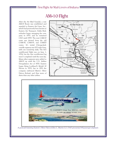 After the Air Mail Scandal, a new AM-10 Route was established and awarded to Eastern Air Lines, Inc., which had previously been known as Eastern Air Transport. Eddie Rickenbacker began managing the company in 1935. and he remained CEO until 1959. The new CAM-10 route was derived from the old CAM-30, CAM-19, and CAM20 routes. It%u2019s initial Chicago-Jacksonville segment was 925 miles long, with one round-trip daily. The first southbound flight was on June 1, 1934, but the first northbound leg wasn%u2019t completed until the next day. Many other segments were added to AM-10 up until the U.S. Airline Deregulation Act of 1978. Eastern began flying Lockheed%u2019s Model 10 Electra in 1935, but in 1951 the company embraced Marin%u2019s Silver Falcon (below), and flew more of them than any other airline.A postcard featuring Eastern%u2019s Silver Falcon (Glen L. Martin Co%u2019s 0-4-0 pressurized 40-passenger airplane).