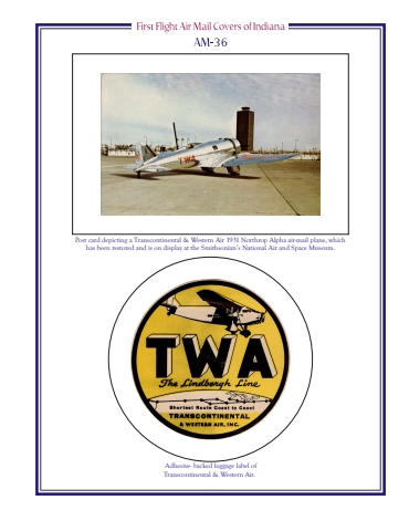 Post card depicting a Transcontinental & Western Air 1931 Northrop Alpha air-mail plane, which has been restored and is on display at the Smithsonian%u2019s National Air and Space Museum. Adhesive- backed luggage label of Transcontinental & Western Air.