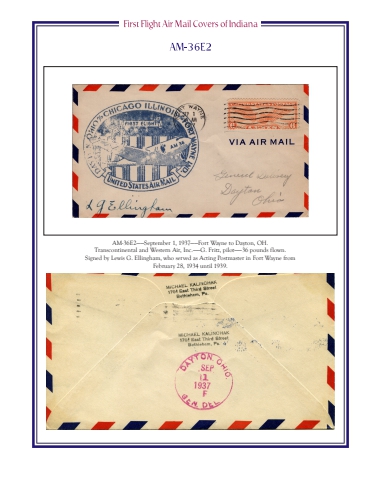 AM-36E2%u2014%u2014September 1, 1937%u2014%u2014Fort Wayne to Dayton, OH.Transcontinental and Western Air, Inc.%u2014%u2014G. Fritz, pilot%u2014%u201436 pounds flown.Signed by Lewis G. Ellingham, who served as Acting Postmaster in Fort Wayne from February 28, 1934 until 1939.