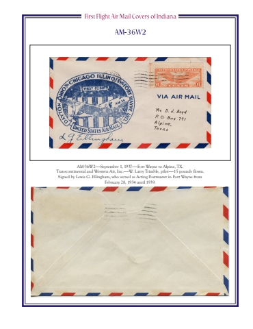 AM-36W2%u2014%u2014September 1, 1937%u2014%u2014Fort Wayne to Alpine, TX.Transcontinental and Western Air, Inc.%u2014%u2014W. Larry Trimble, pilot%u2014%u201415 pounds flown.Signed by Lewis G. Ellingham, who served as Acting Postmaster in Fort Wayne from February 28, 1934 until 1939.