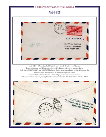 AM-36E5%u2014%u2014December 1, 1941, 8:30 AM%u2014%u2014South Bend to Fort Wayne.Transcontinental and Western Air, Inc.%u2014%u2014I.S. Kravitz, pilot%u2014%u201414 pounds flown.Both AM-1E65 (CAM-17) and AM-36E5 had first flights from South Bend to Fort Wayne on this date which are distinguished by different departure times.There was little advanced notice for this flight, so no cachets were provided.Addressee, Clifford Jackson, was a philatelist who advertised in The Airpost Journal in the 1950s.