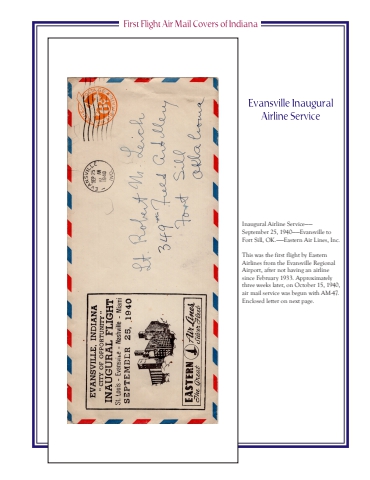 Inaugural Airline Service%u2014%u2014September 25, 1940%u2014%u2014Evansville to Fort Sill, OK.%u2014%u2014Eastern Air Lines, Inc.This was the first flight by Eastern Airlines from the Evansville Regional Airport, after not having an airline since February 1933. Approximately three weeks later, on October 15, 1940, air mail service was begun with AM-47.Enclosed letter on next page.