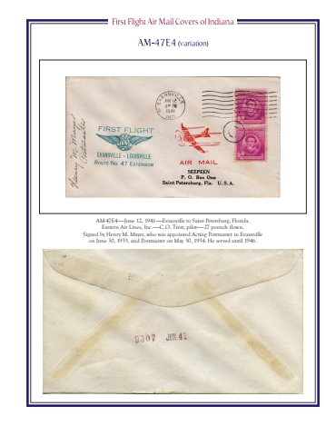 AM-47E4%u2014%u2014June 12, 1941%u2014%u2014Evansville to Saint Petersburg, Florida.Eastern Air Lines, Inc.%u2014%u2014C.O. Trest, pilot%u2014%u201427 pounds flown.Signed by Henry M. Mayer, who was appointed Acting Postmaster in Evansville on June 30, 1933, and Postmaster on May 30, 1934. He served until 1946.