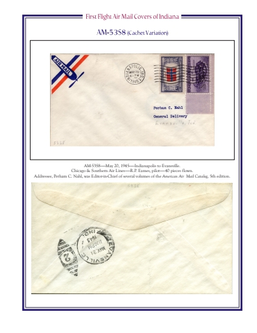AM-53S8%u2014%u2014May 20, 1945%u2014%u2014Indianapolis to Evansville.Chicago & Southern Air Lines%u2014%u2014R.P. Eames, pilot%u2014%u201440 pieces flown. Addressee, Perham C. Nahl, was Editor-in-Chief of several volumes of the American Air Mail Catalog, 5th edition.