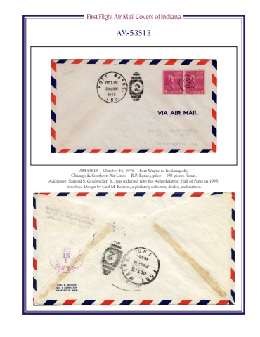 AM-53S13%u2014%u2014October 15, 1945%u2014%u2014Fort Wayne to Indianapolis.Chicago & Southern Air Lines%u2014%u2014R.P. Eames, pilot%u2014%u2014198 pieces flown.Addressee, Samual S. Goldsticker, Jr., was inducted into the Aerophilatelic Hall of Fame in 1993.Envelope Design by Carl M. Becken, a philately collector, dealer, and author.