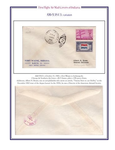 AM-53S13%u2014%u2014October 15, 1945%u2014%u2014Fort Wayne to Indianapolis.Chicago & Southern Air Lines%u2014%u2014R.P. Eames, pilot%u2014%u2014198 pieces flown.Addressee, Albert N. Brown, was an aerophilatelist who wrote an article, %u201cTwenty Years in our Hobby,%u201d in the December 1943 issue of the Airpost Journal. In the 1950s, he was a Director of the American Airmail Society.