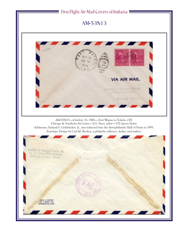 AM-53N13%u2014%u2014October 15, 1945%u2014%u2014Fort Wayne to Toledo, OH.Chicago & Southern Air Lines%u2014%u2014J.G. Enos, pilot%u2014%u2014532 pieces flown.Addressee, Samual S. Goldsticker, Jr., was inducted into the Aerophilatelic Hall of Fame in 1993.Envelope Design by Carl M. Becken, a philately collector, dealer, and author.
