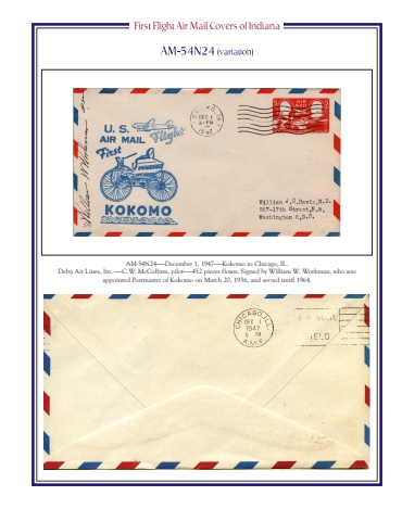 AM-54N24%u2014%u2014December 1, 1947%u2014%u2014Kokomo to Chicago, IL.Delta Air Lines, Inc.%u2014%u2014C.W. McCollum, pilot%u2014%u2014452 pieces flown. Signed by William W. Workman, who was appointed Postmaster of Kokomo on March 20, 1936, and served until 1964.