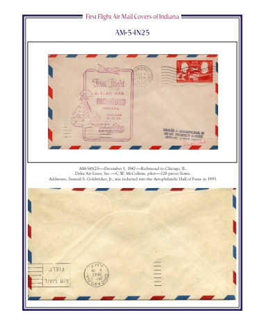 AM-54N25%u2014%u2014December 1, 1947%u2014%u2014Richmond to Chicago, IL.Delta Air Lines, Inc.%u2014%u2014C.W. McCollum, pilot%u2014%u2014228 pieces flown.Addressee, Samual S. Goldsticker, Jr., was inducted into the Aerophilatelic Hall of Fame in 1993.