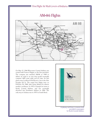 On May 15, 1944 Wisconsin Central Airlines was created with Francis Higgins as the first president. The company was awarded AM-86 in 1948 to deliver air mail to an area that would eventually comprise 1400 route miles and 43 cities. Its first planes were Lockheed 10A Electra%u2019s, but it also flew Douglas DC-3s. The initial first flights were on February 24, 1948, after being delayed by adverse weather conditions. In 1952 it changed its name to North Central Airlines, and was eventually absorbed into Northwest Airlines in 1986. The only stop in Indiana was in 1955 in South Bend.A playing card from a souvenir deck provided to passengers by North Central Airlines.