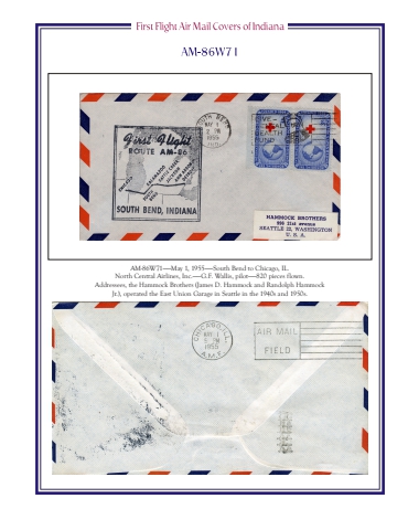 AM-86W71%u2014%u2014May 1, 1955%u2014%u2014South Bend to Chicago, IL.North Central Airlines, Inc.%u2014%u2014G.F. Wallis, pilot%u2014%u2014820 pieces flown.Addressees, the Hammock Brothers (James D. Hammock and Randolph Hammock Jr.), operated the East Union Garage in Seattle in the 1940s and 1950s.