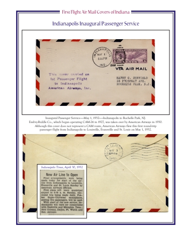 Inaugural Passenger Service%u2014%u2014May 1, 1932%u2014%u2014Indianapolis to Rochelle Park, NJ.Embry-Riddle Co., which began operating CAM-24 in 1927, was taken over by American Airways in 1930. Although this cover does not represent a CAM route, American Airways flew this first round-trip passenger flight from Indianapolis to Louisville, Evansville and St. Louis on May 1, 1932.Indianapolis Times, April 30, 1932
