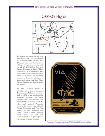 Thompson Aeronautical Corp. was founded in early 1928, and became the successful bidder for the CAM27 air-mail route from Bay City MI to Chicago. It began transporting mail on July 17, 1928 with a fleet of 6 Stinson Detroiter airplanes. When originally placed in operation, CAM27 served more cities than any other route, and it covered the important automotive district in Michigan. It also served cities in New York, Ohio, Illinois, Ontario, and four in northern Indiana.By 1931 Thompson became a subsidiary of its parent company, Transamerican Airlines Corporation and, in 1933, it was purchased by American Airways, the same company that had absorbed the Embry-Riddle Company (and 80 other small airlines). American operated its routes with all-metal Fokker Tri-Motors and Ford TriMotors. By 1934, American was flying Curtiss Condor biplanes which carried air mail and accommodated 15-18 passengers in the ultimate of airline comfort.Thompson Aeronautical Corp. (TAC) CAM-27 luggage sticker.
