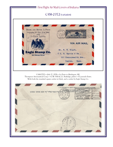 CAM-27E2%u2014%u2014July 17, 1928%u2014%u2014La Porte to Muskegon, MI.Thompson Aeronautical Corp.%u2014%u2014G.W. Hill & J.L. Rutledge, pilots%u2014%u201452 pounds flown.With both the standard square cachet in black, and a cachet by Eagle Stamp Co.