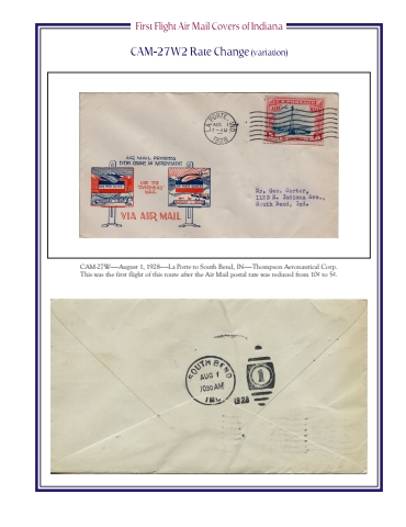 CAM-27W%u2014%u2014August 1, 1928%u2014%u2014La Porte to South Bend, IN%u2014%u2014Thompson Aeronautical Corp. This was the first flight of this route after the Air Mail postal rate was reduced from 10%u00a2 to 5%u00a2.