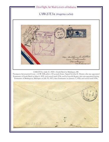 CAM-27E3a%u2014%u2014July 17, 1928%u2014%u2014South Bend to Muskegon, MI.Thompson Aeronautical Corp.%u2014%u2014G.W. Hill, pilot%u2014%u201450 pounds flown. Signed by John N. Hunter, who was appointed Postmaster of South Bend on May 6, 1920, and served until 1936; and by Lincoln Rogers, who was appointed Acting Postmaster of Muskegeon, Michigan on July 30, 1923, then Postmaster on January 3, 1924, and served until 1936.