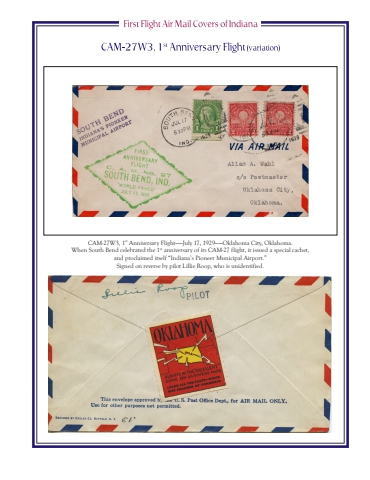 CAM-27W3, 1st Anniversary Flight%u2014%u2014July 17, 1929%u2014%u2014Oklahoma City, Oklahoma.When South Bend celebrated the 1st anniversary of its CAM-27 flight, it issued a special cachet, and proclaimed itself %u201cIndiana%u2019s Pioneer Municipal Airport.%u201d Signed on reverse by pilot Lillie Roop, who is unidentified.