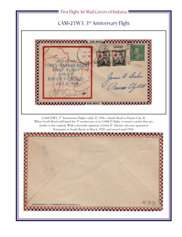 CAM-27W3, 3rd Anniversary Flight%u2014%u2014July 17, 1931%u2014%u2014South Bend to Prairie City, ILWhen South Bend celebrated the 3rd anniversary of its CAM-27 flight, it issued a cachet that was similar to the original. With a facsimile signature of John N. Hunter, who was appointed Postmaster at South Bend on May 6, 1920, and served until 1936.
